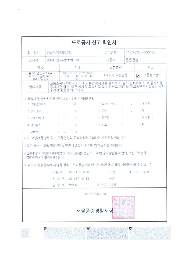 1. 공사명 : 용마터널 PE방호벽 교체 공사