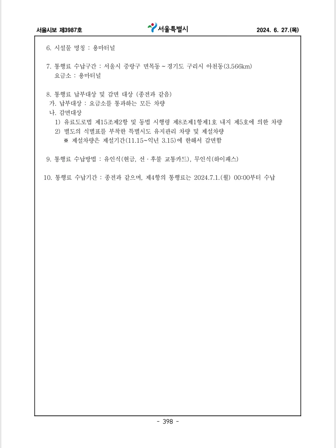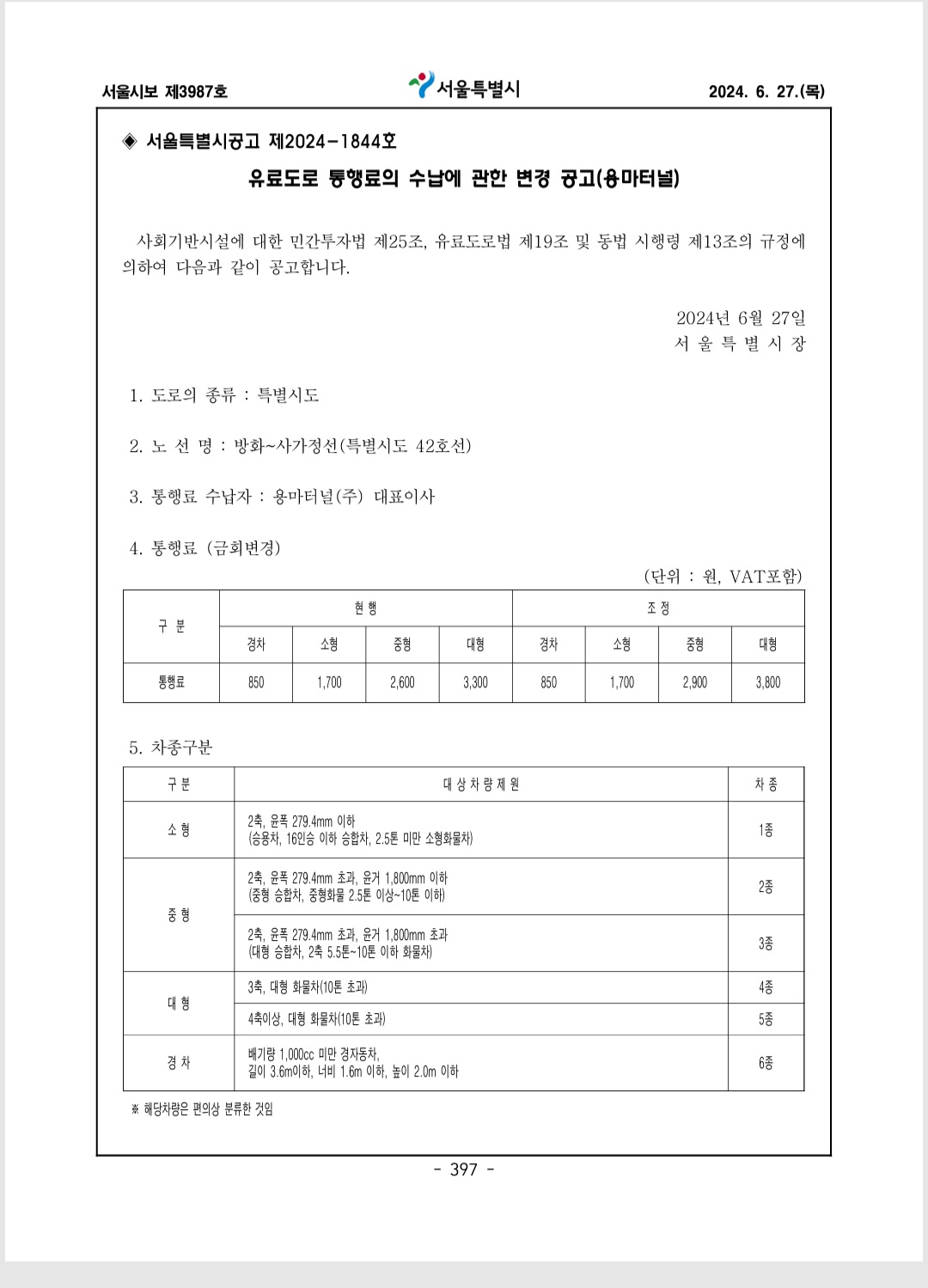 유료도로 통행료의 수납에 관한 변경 공고 (서울특별시 공고 제2024-1844호)에 의거 2024년 07월 01일 00:00시 부터 통행요금이 조정되어 알려드립니다