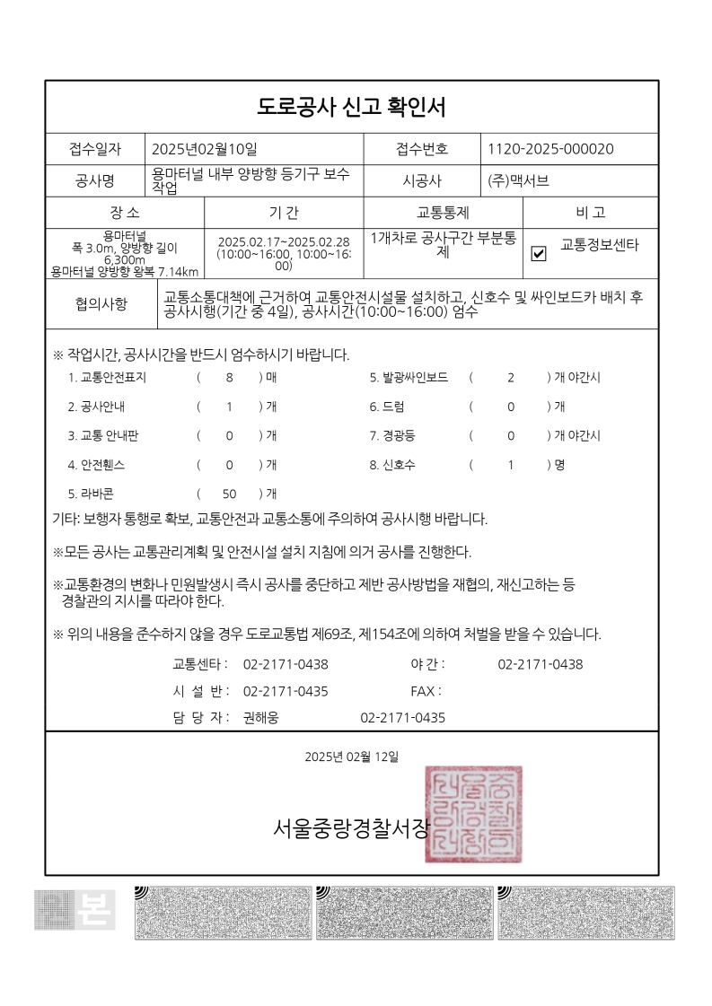 3. 교통통제 : 용마터널 양방향 1개차로 공사구간 부분통제