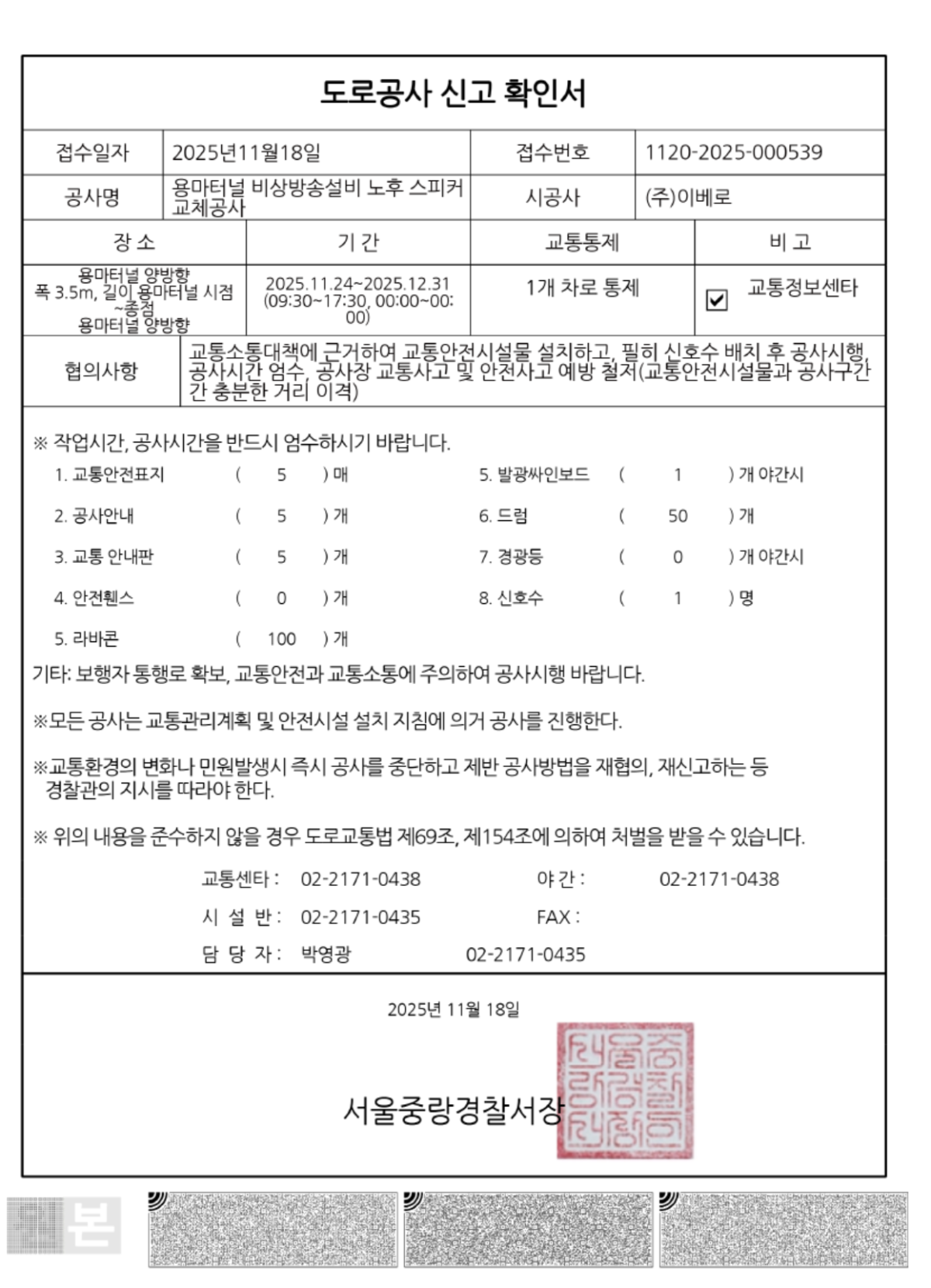 작업으로 인해 도로 이용에 불편을 드려 죄송합니다